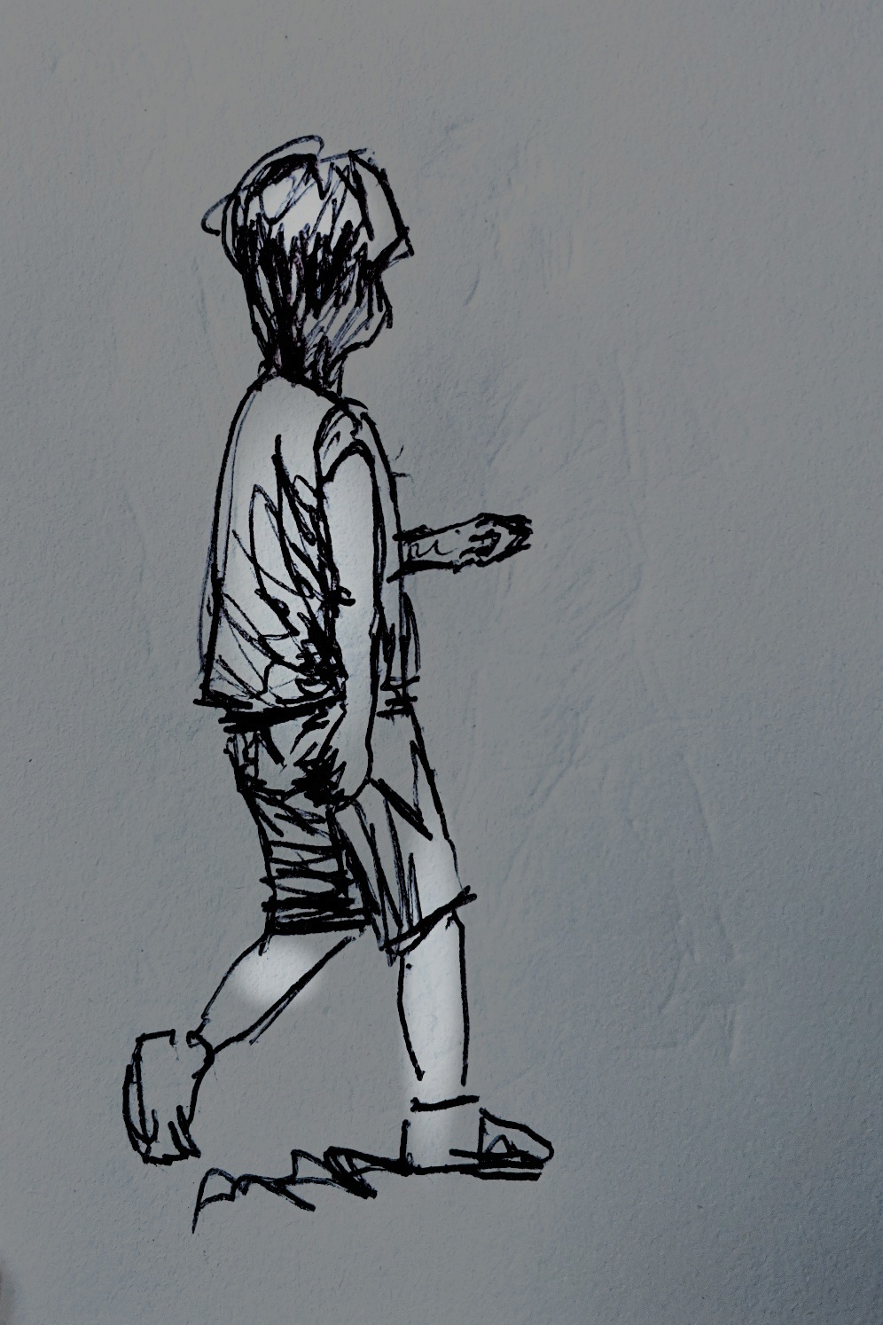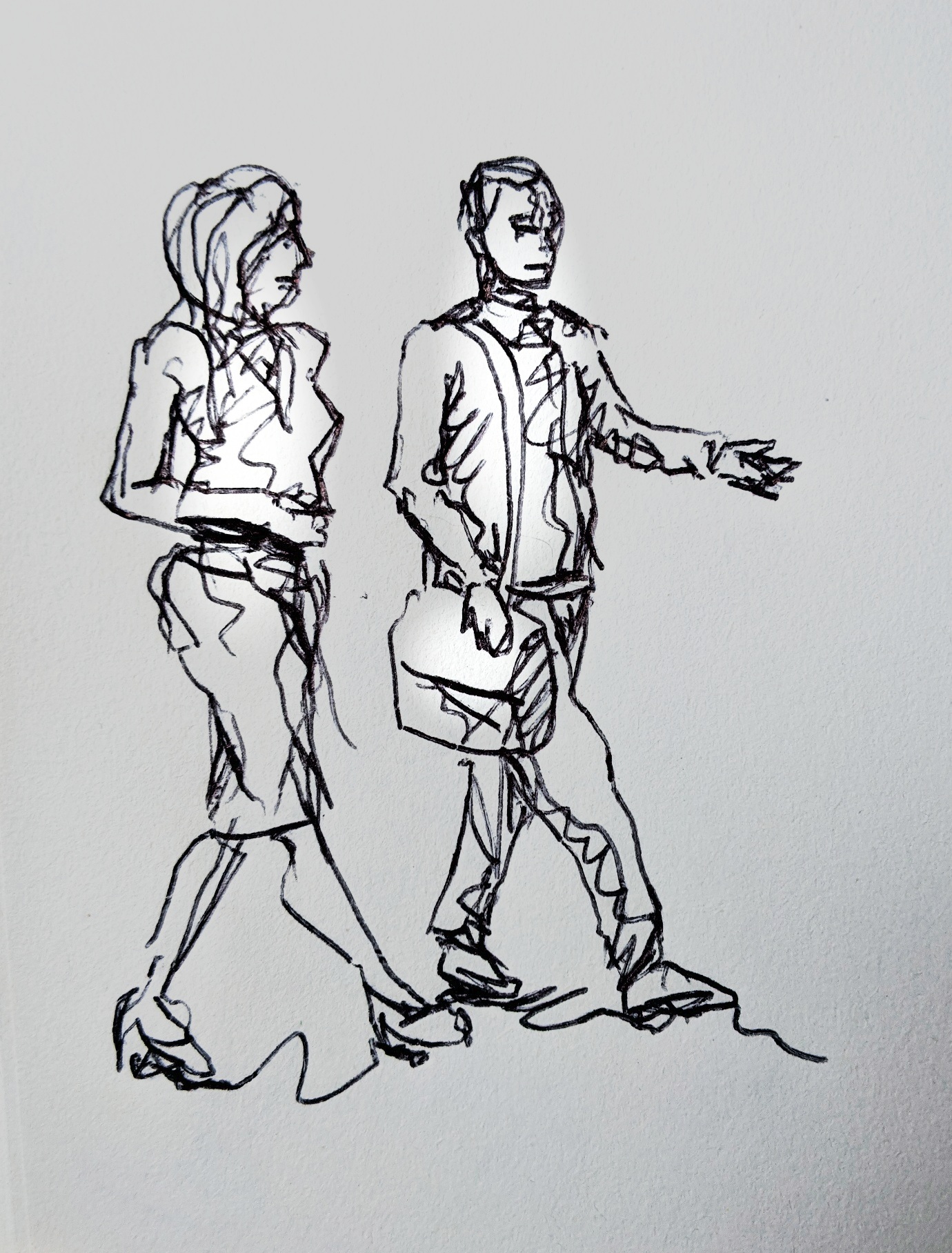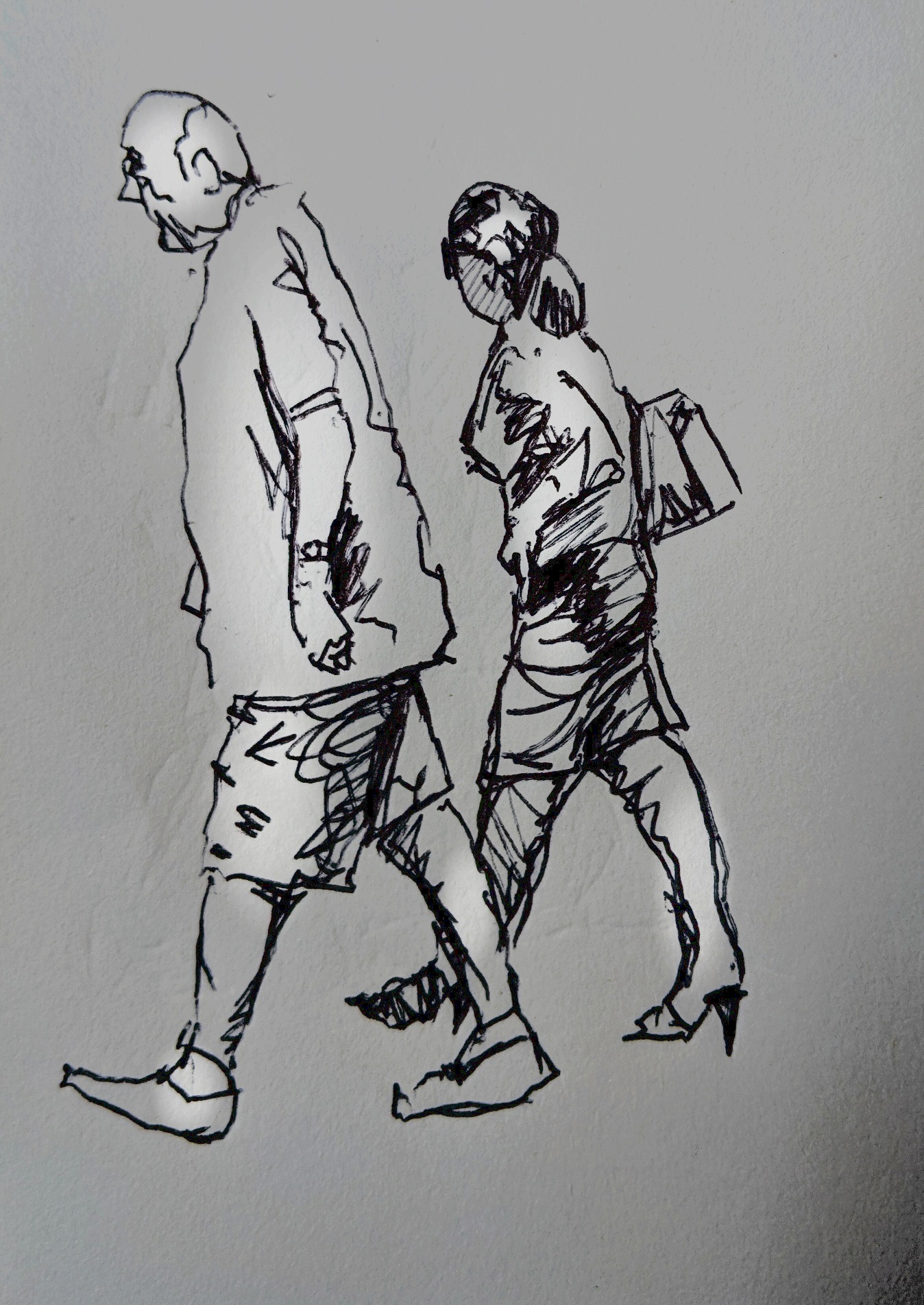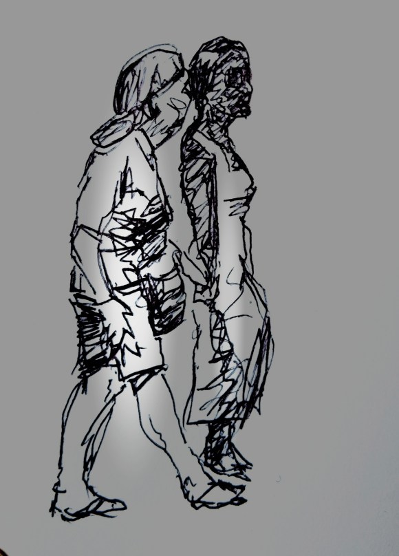 I can walk okay now but, since I spent a few months unable to walk after breaking my leg, the soles of my feet seem to have become much less durable. Consequently it’s currently painful to walk again for me. I have a podiatrist appointment coming up so all will be fine but recent years have made me appreciate the act of walking, how much freedom it brings us and how much we who are lucky enough to be able to walk take it for granted. Here’s a few more of my quick sketches of people walking without a thought.